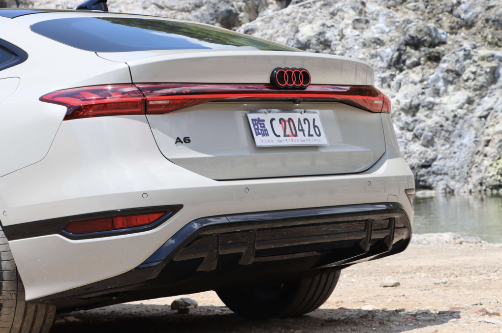 從分離式的Matrix LED矩陣式頭燈組,到平整化的車身底盤與隱藏式車門把手,每一處細節都在為降低空氣阻力而服務。試駕車標配的S line外觀套件與21吋Audi Sport鑄造鋁合金輪圈,更為其增添了不容錯認的動感氣息。車尾橫貫式的數位OLED尾燈組,加上首創的紅色飾光四環logo,在夜幕中點亮時,宣告著它不凡的科技身份。