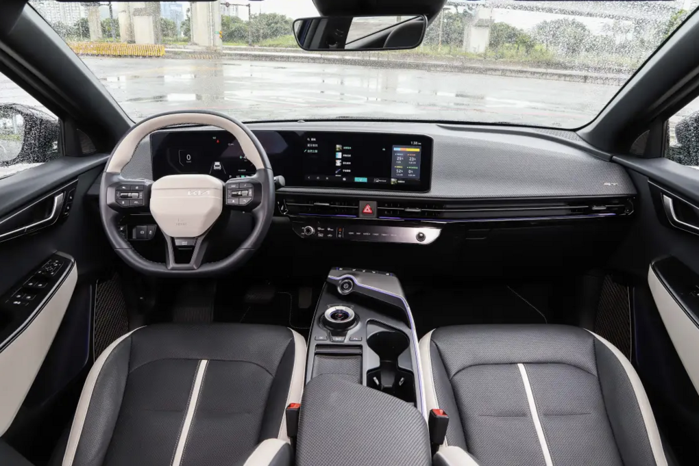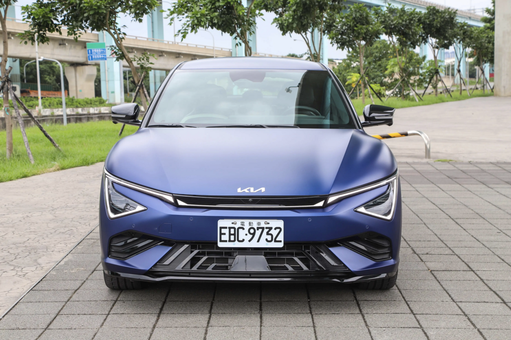 外觀上,The new EV6 GT-line透過更銳利的線條與光影設計,展現出十足未來感。細節部分如感應式隱藏門把手、貫穿式尾燈與全新20吋雙色低風阻輪圈,不僅提升空氣力學表現,也強化整體視覺張力。車燈系統則採用Matrix Parallel LED雙曜頭燈,搭配Star Map LED星圖日行燈與尾燈組,夜間行車照明範圍與精準度皆大幅提升,同時避免對向車輛眩光,兼顧安全與行車舒適性。試駕車款塗裝為全新「消光暴風藍」,搭配黑白雙色內裝與黑色跑車式頂篷,充分體現其頂規身份。