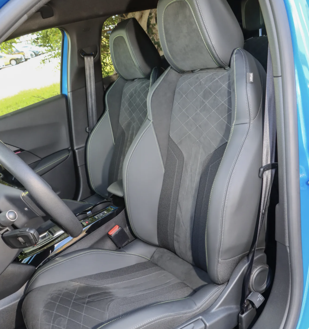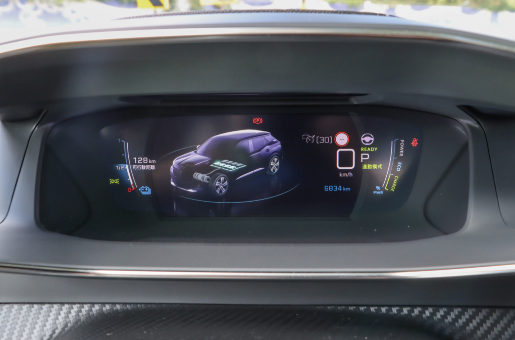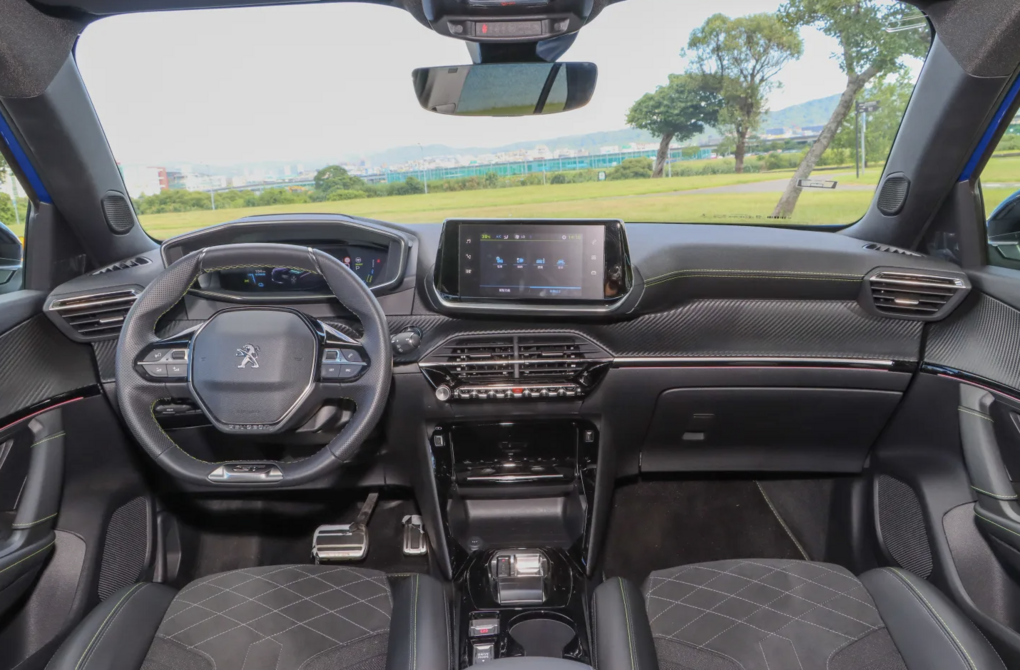 在進入試駕過程之前,e-2008 GT Pack的內裝設計也是車系成功的表現,在車內幾乎找不到廉價感,尤其儀錶台都以大面積軟質素料包覆,中央T字造型則是混搭碳纖維塑膠,門板與儀表板之間的接合處,使用類似吧檯的包覆,讓雙前座的尊榮感大幅提升;而排檔桿則是因為電動車沒有傳統變速箱,因此改為操作更簡單的換檔撥桿,在換檔撥桿後方是電子手煞車與駕駛模式的選擇,值得一提的是,e-2008 GT Pack使用電子手煞車,卻少了Auto Hole功能。