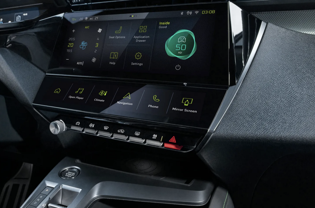 PEUGEOT 408採用集團最新世代EMP2模組化平台,精湛的NVH隔音工程為PEUGEOT 408打造高質感、高靜肅性車室空間,同時,為呵護全車乘員呼吸品質,全車系標配AQS車艙外空氣品質偵測系統及高效率活性碳過濾芯,GT / GT PREMIUM車型則配置CLEAN CABIN座艙內空氣品質偵測系統,有效過濾污染氣體與空氣微粒,並於10吋HD全彩觸控螢幕即時顯示車室內空氣品質狀態,以維持車艙空氣品質。