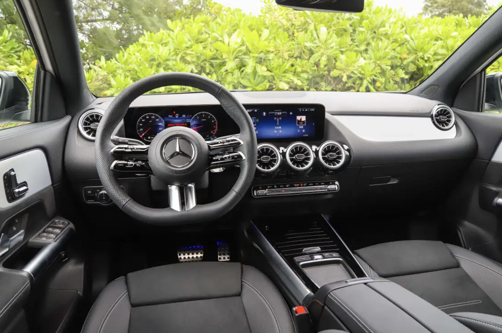 步入車室,迎面而來的是熟悉且現代化的Mercedes-Benz座艙語彙,雙10.25吋高解析度數位儀表與MBUX多媒體系統組成的橫向螢幕整合介面,搭配鋁質飾板與ARTICO/MICROCUT雙材質黑色座椅,車內質感極具水準。方向盤為Nappa真皮包覆的多功能平底跑車方向盤,觸感紮實,結合金屬飾板與觸控按鈕,無論手感或操控回饋皆相當優異。